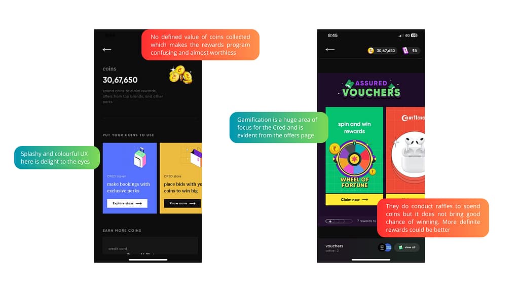 CRED’s Neumorphism-inspired design language, coupled with the Re. 1 = 1 Cred Coin strategy, has successfully driven user engagement. However, refining the rewards program to allow users to settle credit card bills or other bills directly using their reward points could provide more tangible benefits. Diversifying coin usage options, similar to how CheQ operates, might also amplify user engagement.